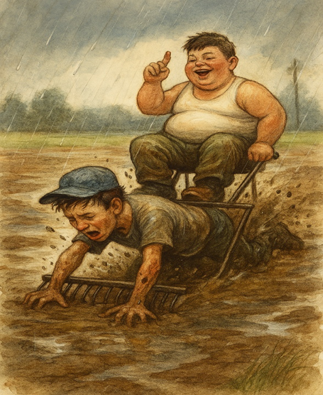 Raking mud was a pain. Muck sucked at our shoes and caked on our rakes . But Norman and I decided to automate the process. I climbed onto the rake, balancing on its tines, while Norman leaned into the handle and dragged me across the infield. My weight carved grooves through the muck, peeling back the soggy top layer and exposing the firmer dirt beneath. Norman heaved against the rake, shoulders hunched and muscles burning as mud splattered up his legs. And there I was, perched on the rake like a conquering hero in a chariot, slicing through the muck with triumphant ease.